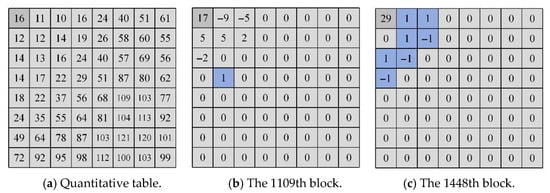 Sort several 8 × 8 quantised DCT coefficient blocks in descending order based on their smoothness estimation values, Sk, prioritising blocks with higher smoothness scores for information embedding. The effectiveness of the proposed smoothness estimation strategy is demonstrated using the following example: As shown in Figure 3, a baboon image with a quality factor (QF) = 50 is selected as the test image. Two DCT coefficient blocks, namely blocks 1109 and 1448, are analysed. If blocks are sorted based on the number of zero coefficients, as depicted in Figure 3b,c, the block in Figure 3b would typically be prioritised for secret embedding due to its higher ranking. However, block 1109 is not the optimal choice among these embeddable blocks. This is because block 1109 can embed only one bit of secret data (embedding information only at ±1), whereas block 1448 can embed up to seven bits. Calculating smoothness using Equation (1), block 1109 yields a smoothness score of 56.0471, while block 1448 yields 56.0499. This demonstrates that Equation (1) effectively distinguishes the priority order of different embeddable DCT blocks. It should be emphasised that the Sk values calculated by Equations (1) and (2) represent approximate distortion values, with the primary objective being to identify the optimal DCT block sequence for information embedding.