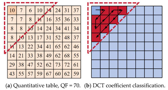 Usually, in the JPEG RDH scheme, employing larger quantisation steps to modify AC coefficients introduces greater image distortion. This degradation is particularly pronounced when embedding DCT coefficients with high magnitudes, resulting in a more significant decline in the quality of the steganographic image. Figure 4a illustrates a quantisation representation example at a quality factor (QF) of 70. The region marked by blue dashed triangles corresponds to smaller quantisation steps, situated within the low-frequency domain. Consequently, the low-frequency region is selected as the candidate embedding area. Experimental results indicate that modifying zero coefficients within this region contributes to achieving superior image quality.