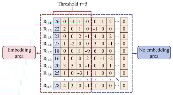 As shown in Figure 5, when the optimal threshold τ = 5, the DCT coefficients for each quantised DCT coefficient block are rearranged to form a reordered coefficient vector denoted as {D(1,1), D(1,2), …, D(8,8)}. The first τ coefficients of each vector constitute the embedding region for information embedding, while the remaining coefficients form the non-embedding region, which remains unchanged to preserve visual quality and minimise file expansion.