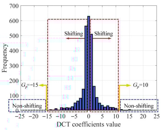 To prevent conspicuous invalid shifts of non-zero coefficients within the embedding region, this method selects two specific coefficients: one designated Gn for negative shift gaps, and another designated Gp for positive shift gaps, thereby reducing shift operations on non-informative embedding coefficients. This strategy effectively minimises unnecessary modifications, thus preserving high image quality. Figure 6 illustrates the local histogram distribution of quantised DCT coefficients at the ninth position across all DCT blocks in the Boat image. Coefficients with values of −15 and 10 both occur with zero frequency; hence, the negative shift gap is set to Gn = −15 and the positive shift gap to Gp = 10. These two gaps govern the range of coefficients requiring shifting during embedding: only coefficients between Gn and Gp undergo shifting to create the embedding space, while coefficients outside this range remain unchanged, thereby minimising distortion. Furthermore, zero coefficients with large quantisation steps in non-embedded regions also remain unmodified. This approach not only enhances the quality of the steganographic image but also effectively suppresses the growth of the JPEG file size.