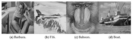 This section conducts experimental comparisons of the proposed algorithm’s performance. The experimental setup comprises a Lenovo YOGA 14s laptop running Windows 10, equipped with an AMD Ryzen 75800H CPU operating at 3.20 GHz and 16.00 GB of memory. The simulation software employed was MATLAB R2016a (version 9.0). Test images were sourced from the BOSSbass image database [29] and the USC-SIPI image database [30]. All images underwent JPEG compression, utilising the IJG toolbox 2014 version [31] with an optimal Huffman coding table for the entropy coding stage. Experiments were conducted using varying quality factors. Four test images, “Barbara”, “F16”, “Baboon”, and “Boat”, are used for result presentation, as shown in Figure 7.