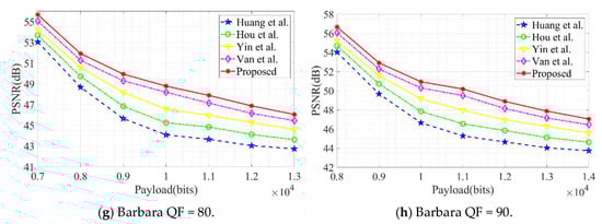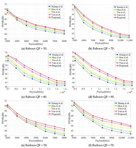 To evaluate the computational efficiency of the proposed algorithm, a comparative experiment on time complexity was conducted using the four test images from Figure 7 under the conditions of a quality factor (QF) of 70 and an embedding payload of 10,000 bits. The running time was measured in seconds, and the results are summarised in Table 2. The experimental results indicate that the average running time of the proposed algorithm is 5.51 s. This is 5.16 s longer than that of Huang et al.’s method, but 12.93 s shorter than that of Hou et al.’s method and 1.64 s shorter than that of Yin et al.’s method. The algorithm by Yin et al. is more suitable for document images with simple structures and exhibits longer running times when processing grayscale images commonly used in reversible data hiding. The average running time of the proposed algorithm is similar to that of Van et al.’s method. This can be attributed to the fact that both algorithms employ a positive-and-negative shift gap strategy, which avoids modifying large DCT coefficients and thereby reduces computational overhead.