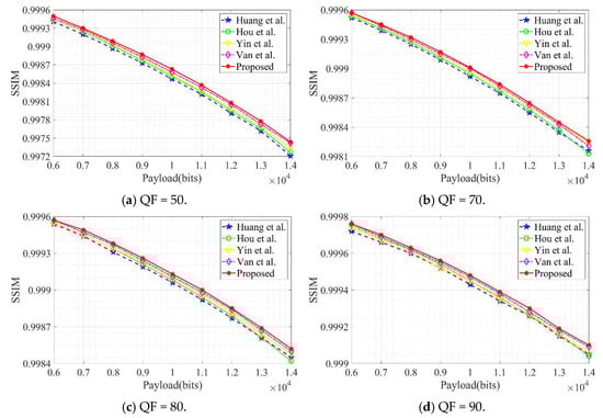 Visual quality is typically quantified using PSNR and SSIM metrics. Higher PSNR and SSIM values indicate superior concealment, signifying that the steganographic image remains visually closer to the original. Experiments compared the proposed algorithm against existing schemes by Huang et al., Hou et al., Yin et al., and Huynh et al. under four quality factor conditions: QF = 50, 70, 80, and 90. Randomly generated binary bitstreams were employed as secret information, with the ‘Baboon’ and ‘Barbara’ images serving as test cases. The comparative results are presented in Figure 8 and Figure 9. Experimental findings demonstrate that, under identical embedding payloads, the proposed algorithm achieves superior PSNR and SSIM values compared to existing approaches, exhibiting enhanced image quality performance.