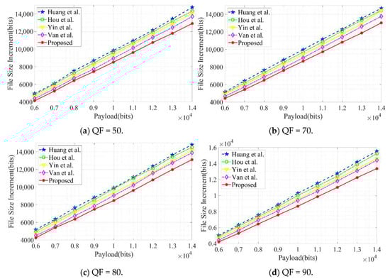 File expansion performance is typically evaluated using the File Size Increase (FSI) metric, which quantifies changes in file volume by calculating the storage size difference between the marked image after steganography and the original JPEG image. A lower FSI value indicates better preservation of image compression efficiency when embedding the same payload of secret information, suggesting the steganography scheme has a smaller impact on file size expansion and thus superior overall performance. Experiments comparing the proposed algorithm with existing schemes by Huang et al., Hou et al., Yin et al., and Huynh et al. were conducted under four quality factor conditions: QF = 50, 70, 80, and 90. The comparative results are presented in Figure 10. Results demonstrate that, under identical payload embedding conditions, the proposed algorithm consistently achieves lower FSI values than the comparison algorithms, exhibiting superior file size preservation capability.