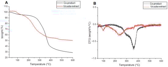 (A) Thermogravimetric (TG) curves of the ucuuba co-product (black line) and extract (red line). (B) Derivative thermogravimetric (DTG) curves of the ucuuba co-product (black line) and extract (red line).