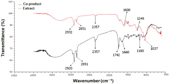 Figure 2 shows the FTIR spectra obtained for the ucuuba co-product and its extract. Absorption bands at wavenumbers of 2920 cm−1 and 2851 cm−1 were observed in the co-product and at 2932 cm−1 and 2851 cm−1 in the extract, referring to hydrocarbon stretching (-C-H). Both presented an absorption band at 2357 cm−1, which is characteristic of the amino group. The band at 1742 cm−1 present in the co-product can be attributed to carbonyl stretching, which is possibly related to polyphenols and carbohydrates. The stretching at 1660 cm−1 and 1600 cm−1 in the co-product and extract, respectively, is characteristic of axial deformation of the aromatic ring (C=C). The extract showed absorption at 1245 cm−1, characteristic of angular harmonic vibration (≡C-H). The co-product and the extract exhibited weak intensity bands at 1180 cm−1 and 1037 cm−1, respectively, which can be ascribed to the axial deformation of -C-O and C(=O)-O in alcohols and phenols [].