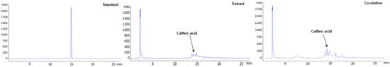 Chromatograms obtained in HPLC-DAD analysis at a wavelength of 330 nm of the caffeic acid standard (15.01 min), of the extract (14.13 min), and after co-elution (standard + extract, 14.38 min).