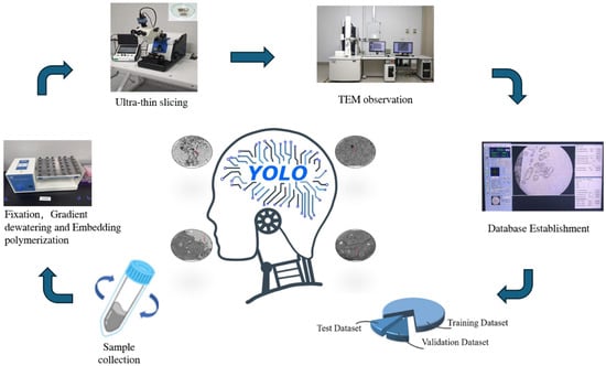 Artificial intelligence (AI), particularly deep learning approaches, has recently shown great promise in automating virus detection from microscopy images [,]. The YOLO (You Only Look Once) object detection family is well known for ensuring real-time detection with high accuracy, making it an attractive choice for virus detection applications []. Studies have successfully applied CNN-based methods for detecting viral particles in TEM images, achieving near-perfect detection metrics []. Furthermore, the availability of benchmark TEM datasets and advancements in network architectures such as DenseNet201, ViResNet, and transformer-based models (e.g., VISN) have paved the way for more accurate and efficient virus detection pipelines [,,].