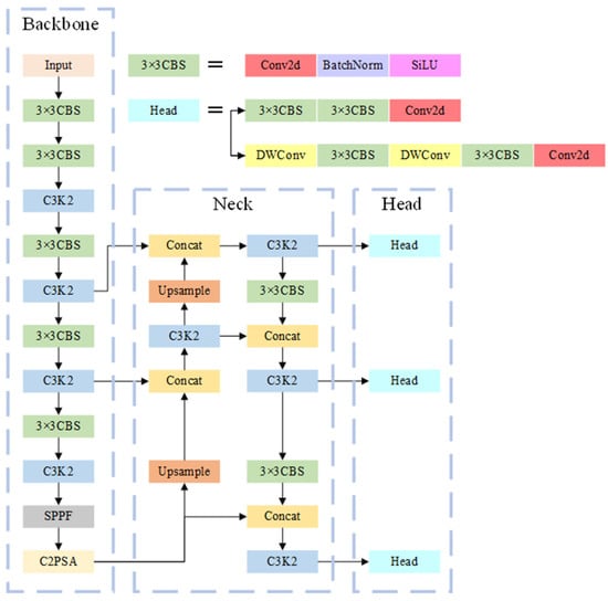 The YOLOv11 is consisted of section Backbone, section Neck and section Head. In the section Backbone, YOLOv11 uses the C3K2 module instead of the C2f module in YOLOv10. As shown in Figure 3, the C3K2 module is composed of multiple C3K modules. Through the superposition of multiple modules, information at different depths is extracted. The C3K module, in turn, contains multiple BottleNeck modules. Residuals can be optionally added to the BottleNeck modules. The residual adds the input and output of the BottleNeck, allowing the combination of shallow and deep information while increasing only a small amount of computational effort. This enhances the network’s feature extraction capabilities.