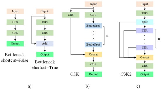 C3K2 Structure Diagram. The C3K2 module is composed of multiple C3K modules. It extracts information at different depths through the superposition of these modules. In turn, each C3K module contains multiple BottleNeck modules. It is optional to add residuals to the BottleNeck module, and the residuals will sum the input and output of the BottleNeck. (a) Bottleneck module, (b) C3k module, (c) C3K2 module.