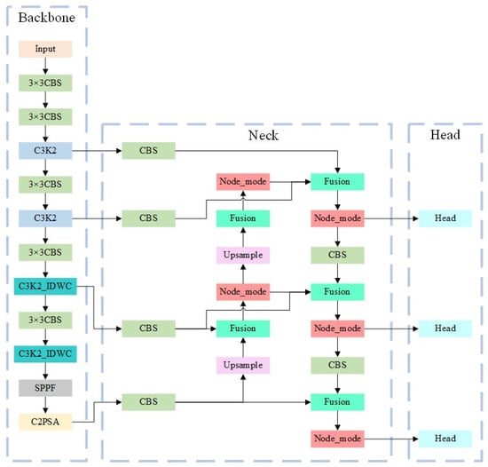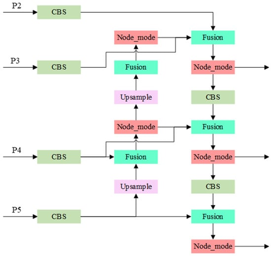 While PANet improves accuracy through down sampling, it demands more parameters and computational effort. For this study, given the relatively simple dataset structure, PANet would introduce unnecessary computational load. Therefore, we introduced the Weighted Bi-directional Feature Pyramid Network (BiFPN), which optimizes cross-scale feature fusion in traditional FPN. BiFPN allows each node to have multiple inputs, enhancing fusion efficiency. Additionally, for nodes with matching input-output layers, BiFPN adds an additional input from the backbone, enabling feature fusion without incurring significant cost. Unlike PANet, BiFPN’s bidirectional paths, treated as identical feature layers, are repeated multiple times to strengthen fusion. The BiFPN structure, shown in Figure 6, includes the Node_mode and Fusion modules. The Node_mode is composed of three C3K2 modules, each of which extracts features by stacking multiple C3K2 modules. The Fusion module generates trainable fusion weights, which are normalized and multiplied by the input feature maps to produce the final fused feature.