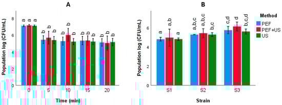 Figure 2. Yeast population dynamics during autolysis under different treatments. (A) Changes in viable yeast counts (log CFU/mL) over time during PEF, US, and PEF + US treatments. (B) Mean viability across the three Saccharomyces cerevisiae strains (S1, S2, S3) between 5 and 20 min. Values represent means ± SD (n = 4). Different letters indicate statistically significant differences between treatments (p < 0.05, ANOVA followed by Tukey’s post hoc test).
