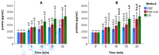 When considering all strains (Figure 3A), a steady increase in protein concentration was observed for US and PEF + US treatments, reaching the highest values at 20 min, with only the US treatment being significantly superior to PEF (p < 0.05). However, when excluding strain S3, the protein release advantage of both US and PEF + US over PEF became statistically clearer (Figure 3B). This confirms that PEF alone is less effective for rapid protein extraction, while US—alone or in combination—enhances autolysis efficiency, particularly in strains with higher inherent susceptibility (S1, S2). The findings reinforce the idea that strain-specific performance can influence average treatment outcomes, a critical point for industrial-scale optimization.
