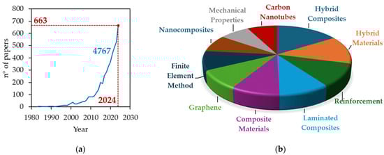 Nowadays, composites are extensively used in the space industry, but further improvements in performance and material multifunctionality are still needed. Indeed, agencies and governments around the globe have established new targets for space exploration, including the creation of settlements on the Moon and on Mars, as well as long-duration missions. To achieve these goals, it is fundamental to design structures that can withstand the harshness of the space environment and, consequently, material development is of primary importance. Hybrid materials have become one of the most investigated solutions thanks to their high-performance capabilities and multi-functionality. These properties are extremely attractive not only for the space sector, but also for many other industrial fields such as automotive, defense, sport, etc. Evidence of the interest in using hybrid composites in space is demonstrated by the graph plotted in Figure 1a, where the number of published papers on this topic from 1980 to 2024 is reported (Scopus database; keywords: “hybrid composites” and “space”; selected document type: “article”). In this period, 4767 manuscripts were published, with 97.1% being published since 2001, 81.4% since 2014, and 663 papers having been published only in 2024. By restricting this analysis to only the “engineering” field, which include 160 keywords, the 10 most used are reported in Figure 1b. Excluding those which refer in general terms to “composites” and “materials”, the trend on the study of hybrid reinforcement is clear; the use of nanomaterials is of primary interest, as well as composites’ mechanical behaviors and microscopy. For comparison, the same research on Google Scholar returns a total number of papers of about 3650, almost the 77% of those obtained by Scopus.