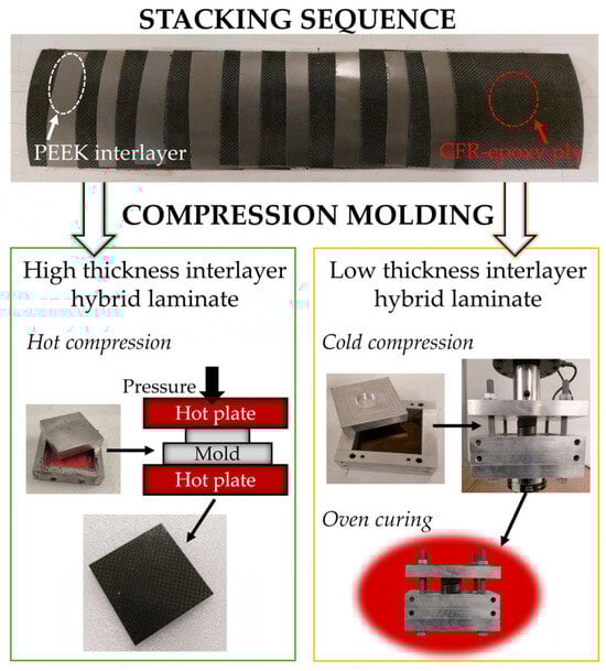 The hybrid laminates were obtained by stacking 10 CFs plies and 9 interlayers, as shown in Figure 2. The hybrid laminate with the high-thickness interlayer was compression molded into an aluminum mold having a square cavity of 70 × 70 mm2. Compression molding was performed using a hot parallel plate press at 5 bar and 250 °C for 15 min, and fluorinated ethylene propylene (FEP) was used for releasing. The low-thickness interlayer composite was compression-molded into a 140 × 140 mm2 aluminum mold. A pressure of 5 bar was applied at room temperature through a steel spring, which was compressed and constrained to the mold. Subsequently, the system was placed in the oven at 350 °C for 90 min for consolidation. A layer of kapton film was placed between the composite and the mold to assist the extraction of the composite laminate from the mold. The two manufacturing procedures are shown in Figure 2.