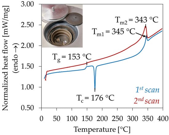 Calorimetry was performed on the PEEK film to investigate the characteristic temperatures of the material. The results are shown in Figure 3, where the temperature–heat flow curve is reported. In the graph, upward and downward peaks are associated with endothermic and exothermic reactions, respectively, which are correlated to phase changes in the material due to heating. In the first scan, a sharp downward peak at 176 °C is observed, as well as an upward peak at 345 °C; these critical values represent the crystallization and the melting temperature (Tc and Tm) of the material, respectively. In the second scan, the downward peak disappears and a flex point at 153 °C is observed clearly. In DSC, this behavior occurs when the glass transition temperature (Tg) of the material is reached, and it passes from a glassy to a rubbery state. As the temperature rises, the sample melts again and, thus, an upward peak is also present in the second scan, at 343 °C.