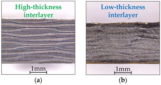 Stereomicroscopy of the manufactured hybrid laminates: (a) composite with the high-thickness interlayer; (b) composite with the low-thickness interlayer.