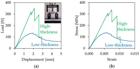 Bending tests on the hybrid laminates: (a) load–displacement curve; (b) stress–strain curve.