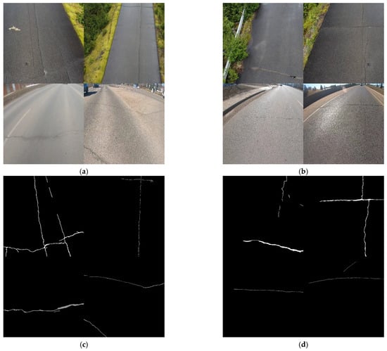 Examples of crack images (a,b) and masks (c,d): (a,c) training set, (b,d) validation set.