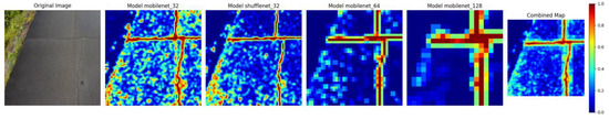 An additional observation concerns the relative performance of Transformer-based classifiers compared with lightweight CNNs. Despite their strong results on large-scale vision benchmarks, pre-trained Transformer backbones underperformed in our setting. Three factors likely explain this outcome. First, Transformers are known to require very large training datasets to exploit their self-attention capacity effectively, whereas our patch-level datasets (32 × 32, 64 × 64, 128 × 128) were comparatively limited. Second, the architectural complexity of Transformers may constitute an over-design for the relatively simple binary classification task of distinguishing crack versus non-crack patches, resulting in higher computational overhead without proportional accuracy gains. Third, the self-attention mechanism of Transformers aggregates information across patch windows (e.g., 7 × 7 or 16 × 16), which favors capturing global context but may overlook very fine local structures. By contrast, convolutional kernels in lightweight CNNs (e.g., 3 × 3 filters in MobileNet or ShuffleNet) are inherently suited to emphasize local textures and thin crack patterns. Together, these factors explain why CNNs produced more reliable probability maps in this study, making them preferable for small-data regimes and real-time applications.