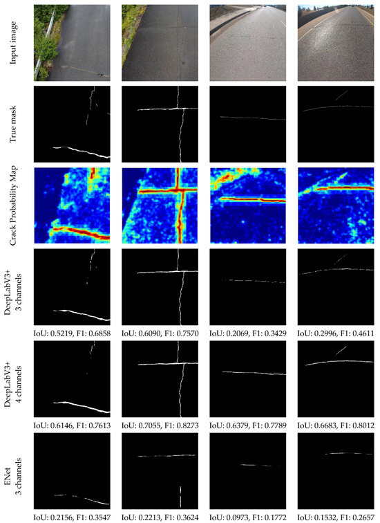 A more detailed examination of these aspects highlights their implications. First, the dataset consisted of 935 images (702 training, 233 validation), captured in relatively narrow acquisition settings (sunny UAV flights and action camera recordings during winter). While sufficient to demonstrate feasibility, this limited coverage restricts the generalization of trained models to other pavement types (e.g., concrete, composite, or different asphalt mixes) and environmental conditions such as nighttime, rain, or strong shadows. Second, the effectiveness of segmentation is tied to the reliability of the probability maps: localized false activations (e.g., shadows, vegetation, or debris) can reduce confidence in the four-channel input. Third, the improvements obtained with probability maps are not uniform across segmentation backbones: Stronger architectures tend to show moderate yet stable gains, while weaker baselines benefit more substantially, in some cases surpassing initially stronger models. Finally, model selection based on different checkpointing criteria (loss vs. IoU) led to noticeable variations in outcomes, underscoring sensitivity to training dynamics.
