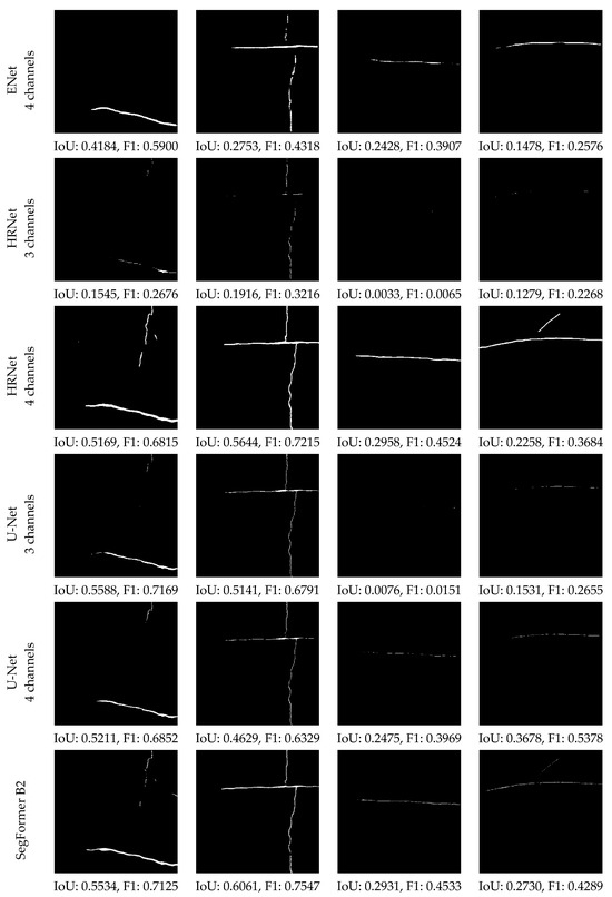 Table 10, Table 11, Table 12, Table 13 and Table 14 summarize the validation of precision, recall, F1-score, IoU, and loss for each model in two settings—best checkpoint selected by loss and by IoU—and report the relative change (Δ%) from three-channel to four-channel inputs. Overall, the four-channel configuration improves performance across all architectures. For example, DeepLabV3+ improves IoU from 0.5697 → 0.6062 (Δ +6.41%) when selected by IoU, with consistent gains in precision, recall, and F1-score; ENet shows larger relative gains (e.g., IoU +59.48% when selected by IoU); and U-Net exhibits modest improvements (IoU +1.44–23.72% depending on the checkpointing criterion). Very large relative increases observed for HRNet stem from low three-channel baselines. Among Transformer-based models, SegFormer B2 and SwinUNet Tiny achieve IoU values of 0.2719 and 0.5649, respectively, which remain below the best-performing CNN-based four-channel configurations. As a reference, YOLO11x-seg attains an IoU of 0.4987, also lower than DeepLabV3+.