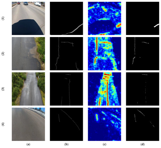 High-Resolution Network (HRNet) [35]—a high-resolution network that maintains multi-scale feature representations throughout the processing pipeline. This enables the accurate capture of thin cracks against complex asphalt textures.