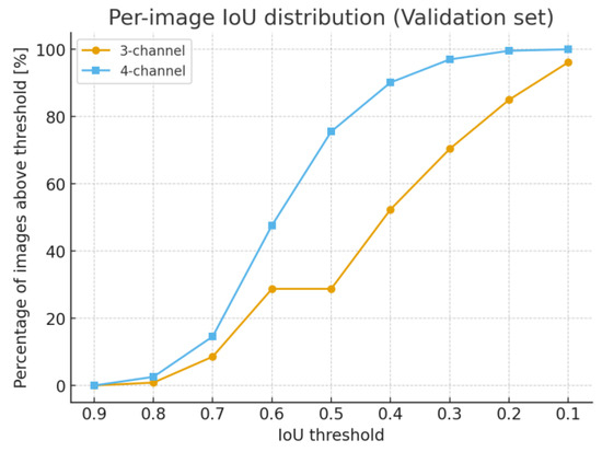 Distribution of per-image IoU scores on the validation set for three-channel and four-channel models. The cumulative percentage of images above each IoU threshold is shown. Four-channel models consistently achieve higher proportions of high-IoU predictions.