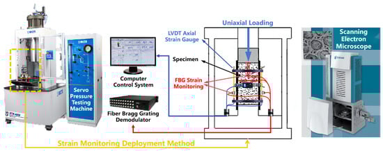 The experimental system consists of a loading system, an optical fiber strain acquisition system (Zhixing, Nantong, China), and a scanning electron microscope (SEM, TESCAN, Brno, Czech Republic) (as shown in Figure 1). The loading control system is the RTR-4600 high-temperature and high-pressure rock testing system (GCTS, Tempe, AZ, USA), which can achieve both stress control and displacement control, with a maximum load capacity of 4600 kN. The system is also equipped with an LVDT (GCTS, Tempe, AZ, USA) for axial deformation measurement, with an accuracy of 0.25% FS and a range of ±6 mm. The optical fiber acquisition system is composed of an optical FBG strain sensor and a modulator–demodulator. The modulator–demodulator uses frequency-sweep laser measurement technology to collect data via full-spectrum scanning. The data acquisition frequency is 2000 Hz, with an accuracy of ±1 pm and a resolution of 0.1 pm. The SEM was used to observe the microstructure at the bonding interface between the FBG sensor and the sample. The resolution of the SEM backscattered electron detector is less than 3.5 nm.