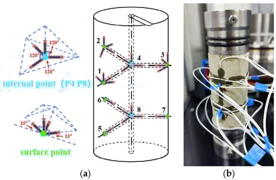 Before the formal tests, a series of preliminary experiments involving more than 30 sandstone samples were conducted to investigate the coupling characteristics between the FBG sensors and the rock material. These included various single-point and multi-directional sensor layouts. The final deployment scheme used in this study was selected based on the performance stability and measurement accuracy observed in the pre-tests. As shown in Figure 2a, to more intuitively describe the different monitoring points, they were labeled as points 1 to 8. Among them, points 4 and 8 were located at the central points inside the sample, with multi-directional strain sensors arranged as one FBG in the vertical direction and three FBGs in the horizontal direction at 120° intervals. The remaining 6 points were surface monitoring points, with one FBG arranged in the vertical direction at each point. Of the three FBGs arranged in the horizontal plane, two were placed with a 150° angle along the surface, and the middle one was placed in the hole, pointing toward the center of the hole. All FBG strain sensors were adhered with epoxy resin, and the coupled sample is shown in Figure 2b.