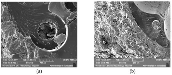 For the FBG sensor set inside the hole, the thickness of the adhesive layer is clearly thicker compared to Figure 4a, as seen in Figure 4b. The thickness of the adhesive layer, measured from the image, is , thus . The length of the FBG sensor and other parameters remain unchanged, and based on Equation (1), it can be calculated that .