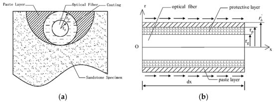 It is assumed that a half-circular groove is carved on the surface of the rock, with a radius equal to the diameter of the optical fiber protective layer, denoted as . The optical fiber is attached within this groove using an adhesive. The length of the FBG strain sensor is denoted as 2L = 10 mm, and the coupling cross-section schematic is shown in Figure 5a. Additionally, for the adhesive layer, the thickness varies along the circumferential direction of the optical fiber coating. However, since the pre-drilled hole and groove dimensions are relatively small, and epoxy resin is selected as the adhesive layer with a high strain transfer efficiency, it is assumed that the adhesive layer is uniformly distributed around the sensor. The mechanical model for the fiber attached to the surface of the sample is the same as the mechanical transfer model for the fiber placed inside the hole. The stress transfer schematic is shown in Figure 5b. The relationship between the real strain of the specimen and the FBG strain is defined as the strain transfer rate α, which can be expressed as follows:
