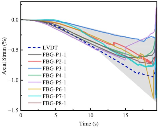 To verify the accuracy of strain measurements based on FBG, the axial (z-axis) strain at each monitoring point was compared with the LVDT data, as shown in Figure 6. During the loading process leading to instability and failure of the sandstone specimen, the axial strain responses from all eight FBG monitoring points exhibited a similar decreasing trend to the LVDT data. Throughout the entire loading range, the strain values measured by the LVDT consistently fell within the shaded envelope formed by the FBG axial strain data, and the maximum difference between the average axial strain values from the eight FBG sensors and the LVDT measurement was 0.23%.
