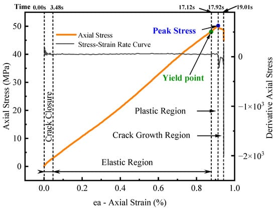 Figure 7 presents the stress–strain curve and the corresponding tangent modulus curve of the sandstone specimen under uniaxial compression at a displacement loading rate of 0.1 mm/s. The tangent modulus curve reflects the instantaneous stiffness of the specimen during loading, and in this study, it is used in combination with the stress–strain curve to qualitatively identify the deformation stages. Based on the overall trends of the two curves, five stages can be distinguished: the compaction phase (Stage I), the elastic phase (Stage II), the plastic phase (Stage III) after the yield point, the crack propagation phase (Stage IV), and the complete failure phase (Stage V). During the initial 3.48 s of loading, fluctuations in the tangent modulus curve indicate the gradual closure of internal pores or microdefects; however, the short duration of this stage may also be influenced by the relatively fast loading rate, initial microcracks introduced during sample preparation, and system-related factors. The specimen then enters the elastic phase, where the stress–strain curve exhibits an almost linear increase, and the tangent modulus remains relatively stable. At approximately 17.12 s, the yield point occurs, and the specimen transitions into the plastic phase. The stress–strain curve changes from linear to nonlinear, and the tangent modulus shows more pronounced fluctuations, which may be associated with the initiation and growth of microcracks within the material. After about 0.8 s, the specimen reaches its ultimate compressive strength (UCS = 50.2 MPa). Beyond the peak stress point, the stress–strain curve drops sharply, indicating strain softening; internal cracks propagate and coalesce, and by 19.01 s the stress has decreased markedly, indicating complete instability and failure of the specimen. Throughout the loading process, the sandstone exhibits pronounced brittle failure characteristics, accompanied by local surface spalling and through-going shear cracks. It should be noted that the stage classification in this study is primarily based on the stress–strain curve in future work, secant modulus analysis will be employed for comparison to further verify the reliability of the stage classification.