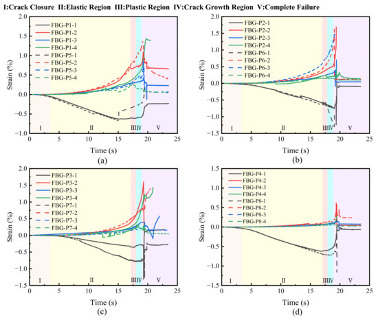 At each monitoring point of the sandstone specimen, the first sensor is arranged along the axial direction, while the second, third, and fourth sensors are arranged along the radial horizontal direction. Figure 8 shows the strain monitoring values from the FBG sensors at all monitoring points in the four directions mentioned above, with the curves representing the variation of strain over time. The five time periods divided by the background correspond to the five stages in the stress–strain curve during the loading process (as shown in Figure 7).