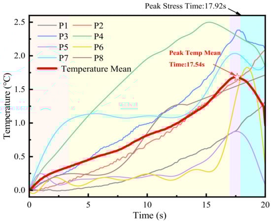 Temperature increment time histories at each point and the corresponding mean temperature curve during the uniaxial compression test.