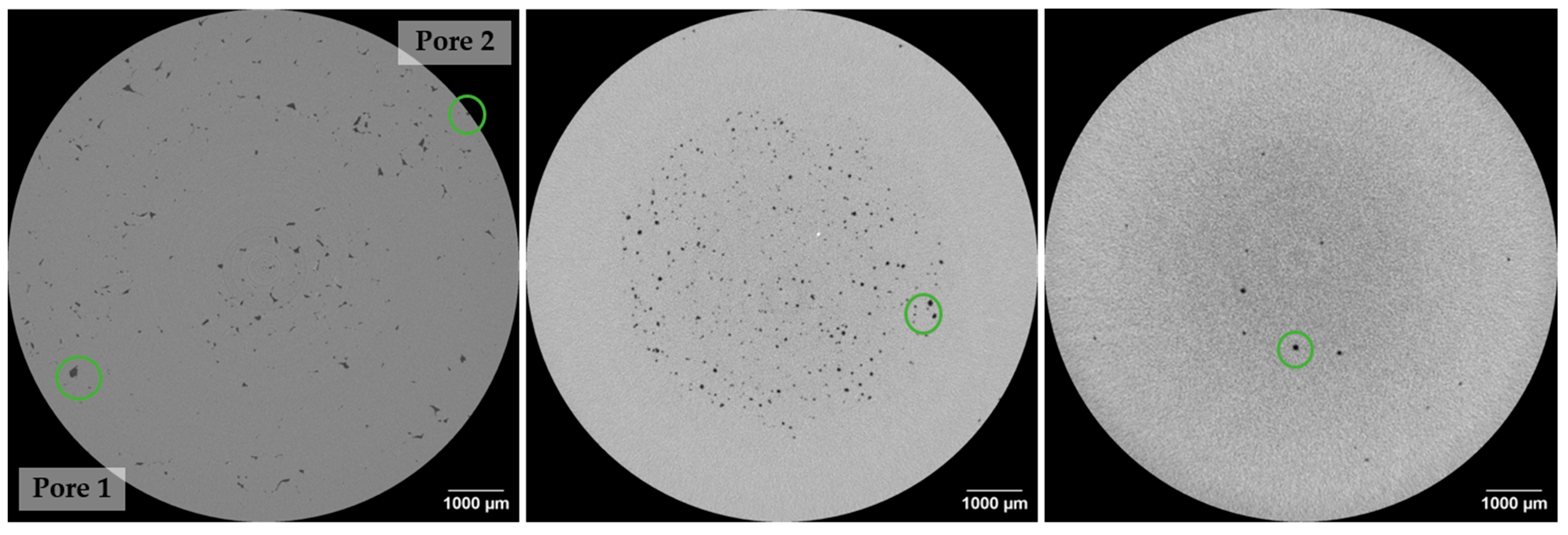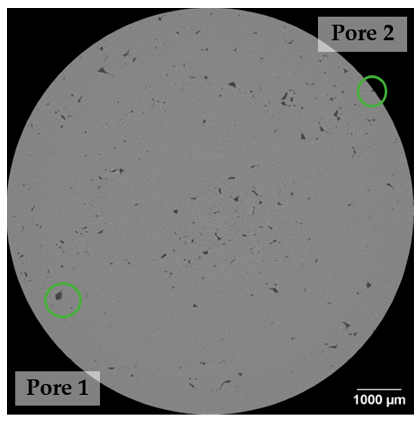 - Baumgärtner, B.; Hussein, J.; Hausotte, T. Investigation of the Shape and Detectability of Pores with X-Ray Computed Tomography. J. Manuf. Mater. Process. 2023, 7, 103. [Google Scholar] [CrossRef]