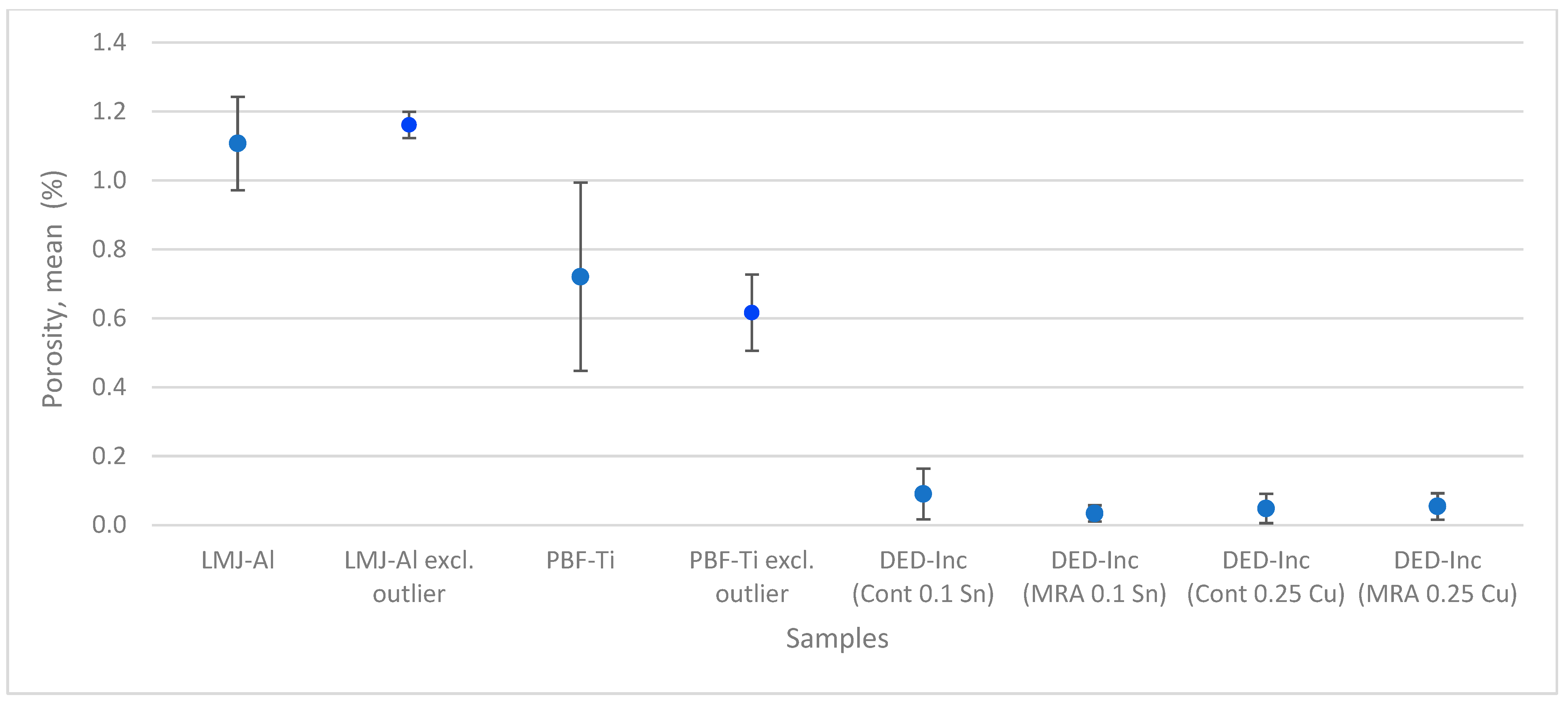 LMJ-Al | LMJ-Al (excl. Outlier) | PBF-Ti | PBF-Ti (excl. Outlier) | DED-Inc | ||||