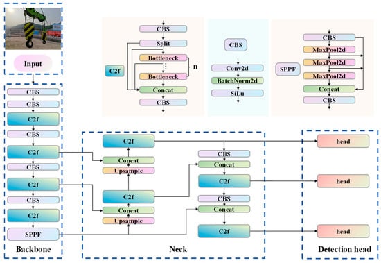 The YOLOv8 model was released by Ultralytics in 2023 [44]. The high detection speed and precision of the YOLOv8 model establish it as an optimal framework for object monitoring and tracking applications. Typical application scenarios for the model include autonomous driving, intelligent surveillance, and industrial inspection [48]. The network architecture of YOLOv8 is illustrated in Figure 1. Its architecture comprises four key components: the input module, the backbone network, the neck network, and the detection head.