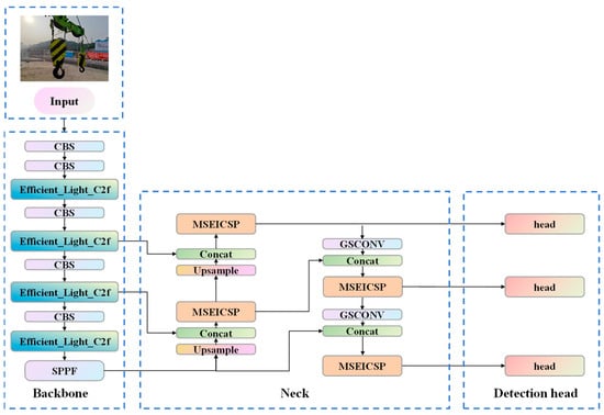 To enhance the detection precision of lifting hooks and safety latches, herein, we propose an improved detection model based on YOLOv8s, referred to as YOLO-HOOK. The network architecture is illustrated in Figure 2. The improved detection model incorporates three key components: Efficient_Light_C2f, MSEICSP, and HOOK_IoU loss function.