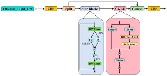 - Efficient_Light_C2f module: We integrate the lightweight Star Block and the CGLU with the C2f module, thereby proposing the Efficient_Light_C2f module. This design leverages the lightweight characteristics of the Star Block and the channel attention mechanism of CGLU, enabling the network to maintain low computational cost while enhancing feature extraction capability. Consequently, it improves the model’s robustness and adaptability to complex or variant inputs.