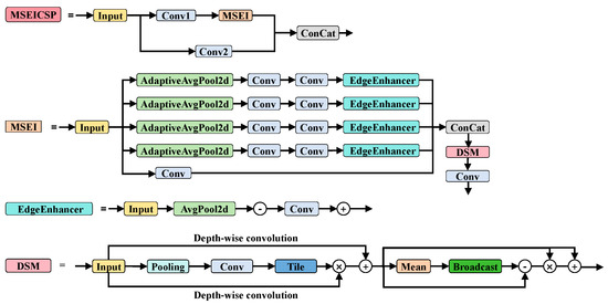 Multi-scale Efficient (MSEI) serves as the core submodule of MSEICSP. AdaptiveAvgPool2d processes the input feature map to generate four branches with differentiated resolutions. Simultaneously, a direct convolutional branch is included to balance the computational load. Each branch undergoes basic feature extraction via two convolutional layers. In the four fine-grained branches, the convolutional output of each branch is connected to an EdgeEnhancer module. The features from all branches are then concatenated and fed into a dual-domain selection mechanism (DSM) [54] module. Lastly, the features outputted by the DSM are processed by a convolutional layer for channel integration and dimension adjustment, forming enhanced features that are adapted to downstream tasks, preserving both multi-scale semantics and edge details while achieving precise matching of feature dimensions.