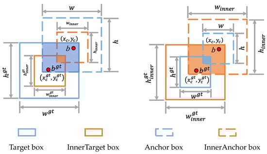 Specifically, HOOK_IoU introduces the concept of an auxiliary bounding box, the size of which is adjusted by setting a scale factor (ratio, the default value is 0.7). The boundary coordinates of the auxiliary bounding box for the ground truth box were calculated using Equations (3)–(6):