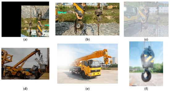 The dataset was compiled using a dual approach involving onsite photography at construction sites and acquisition of publicly available online images. On-site photography involves capturing images of the hooks and safety latches in various states and scenarios using mobile phones. Public online images were collected by systematically searching and downloading relevant images from reputable search engines, such as Baidu and Google. All collected images, regardless of their origin, were stored in JPG format. As the initial dataset consisted of images of varying dimensions, the collected photos were processed using an open-source lossless image processing application for normalization (resizing). Common data-augmentation techniques were applied to enhance data diversity. These techniques included rotation, zoom-in view, and luminance enhancement, which were used to simulate the hooks and safety latches under varying angles and lighting conditions. Different types of images are shown in Figure 6. Lastly, a dataset of hooks and safety latches comprising 2333 original images was constructed. All images were resized to 640 × 640 pixels.