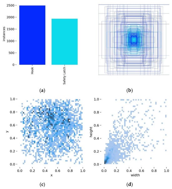 Visualization and statistical analysis of the dataset comprising lifting hooks and safety latches are presented in Figure 7. (a) illustrates the number of instances for the two categories, hooks and safety latches, reflecting their distribution within the dataset; (b) portrays the spatial allocation profile of all annotated bounding geometries; (c) presents the concentration mapping of target centroid positions; and (d) elucidates the proportional interplay between object width and height in the annotations. The results indicate that although the number of hook instances slightly exceeds that of safety latches, the two categories are of comparable magnitude, rendering the class balance acceptable. The distribution of target center points is relatively uniform, and the width-height distribution of the targets shows significant clustering. Additionally, the dataset contains a relatively large number of small targets. These characteristics demonstrate that the dataset is suited for detection tasks involving lifting hooks and safety latches.