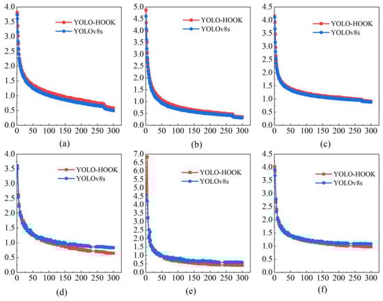 Training (train) and validation (val) loss curves for box_loss, classification loss (cls_loss), and distribution focal loss (dfl_loss) in the baseline YOLOv8s and the proposed YOLO-HOOK models. Blue curves represent YOLOv8s and red curves represent YOLO-HOOK. (a–c) represent the training losses, including box regression loss (train/box_loss), classification loss (train/cls_loss), and distribution focal loss (train/dfl_loss), respectively, while (d–f) represent the corresponding validation losses (val/box_loss, val/cls_loss, and val/dfl_loss, respectively).