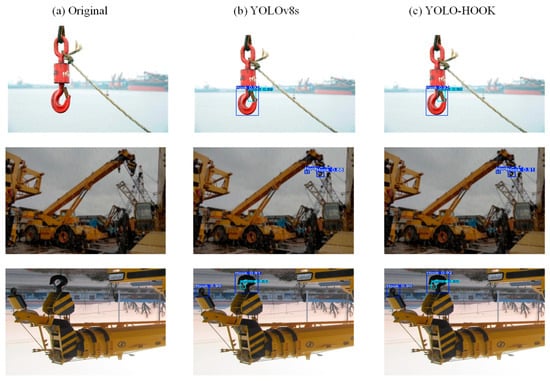 Comparison of object detection results before and after the proposed model improvement: (a) original images of hooks and safety latches; (b) detection results obtained using the baseline YOLOv8s model; (c) detection results obtained using the proposed YOLO-HOOK model.