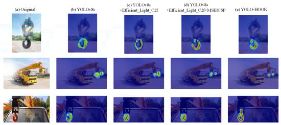 Progressive comparison of object detection heatmaps illustrating the effect of incremental model improvements: (a) original images of hooks and safety latches; (b) heatmap generated by the baseline YOLOv8s model; (c) heatmap from YOLOv8s + Efficient_Light_C2f; (d) heatmap from YOLOv8s + Efficient_Light_C2f + MSEICSP; (e) heatmap from the final YOLO-HOOK model.