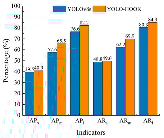 To evaluate the performance of the improved YOLO-HOOK model in multi-scale object detection tasks, a comparative analysis was conducted between the YOLO-HOOK model and the baseline YOLOv8s model in terms of Average Precision (AP) and Average Recall (AR) across different object scales. The experimental results and corresponding comparison plots are presented in Table 4 and Figure 11. As shown in the results, the YOLO-HOOK model consistently outperforms the baseline model across all object scales. For small object detection, AP increased from 39.5% to 40.9%, representing an absolute improvement of 1.4%, while AR rose from 48.8% to 49.6%, yielding a gain of 0.8%. For medium-scale objects, the performance improvement was more pronounced, with AP rising from 57.6% to 65.5% (an increase of 7.9%) and AR improving from 62.2% to 69.9% (a rise of 7.7%). In large object detection, AP improved from 76.6% to 82.2%, up by 5.6%, and AR increased from 80.3% to 84.9%, marking a gain of 4.6%. These results demonstrate that the improved YOLO-HOOK model achieves superior detection performance across different object scales, with the most significant enhancement observed in medium-scale object detection. This indicates that the proposed improvements effectively strengthen the model’s feature extraction and discrimination capabilities for objects of varying sizes, thereby enhancing the overall object detection performance.