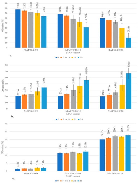 Changes in O2 (a), CO2 (b) and N2 (c) content in MAP packages with beef steaks during long-term storage (mean values). The symbols identifying significant differences are as follows: A–C—means with different letters differ significantly at p ≤ 0.05 within MAP variants at particular day of storage; a–c—means with different letters differ significantly at p ≤ 0.05 within storage days for particular packaging variant.